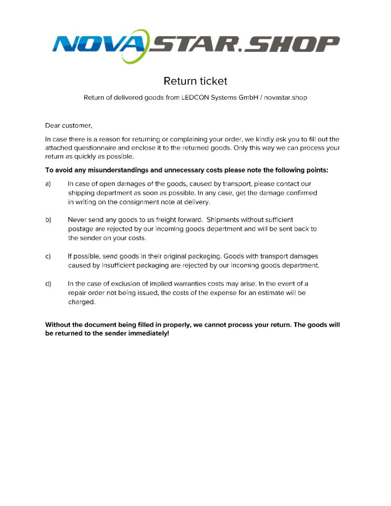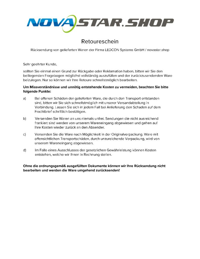 Mit Ihrer Lieferung stimmt etwas nicht oder Sie wollen Ware aus einem anderen Grund retournieren? Füllen Sie bitte dazu den Retourenschein aus und legen Sie diesen der Sendung bei!